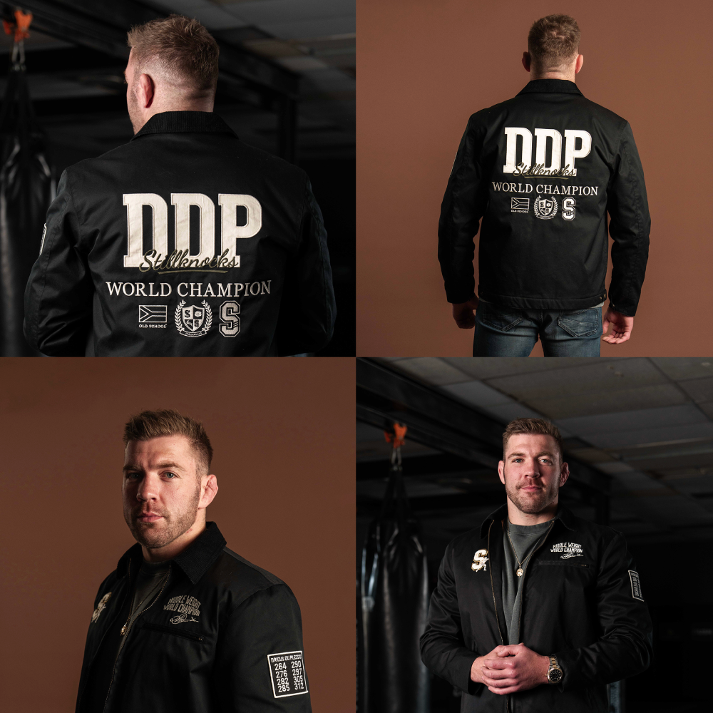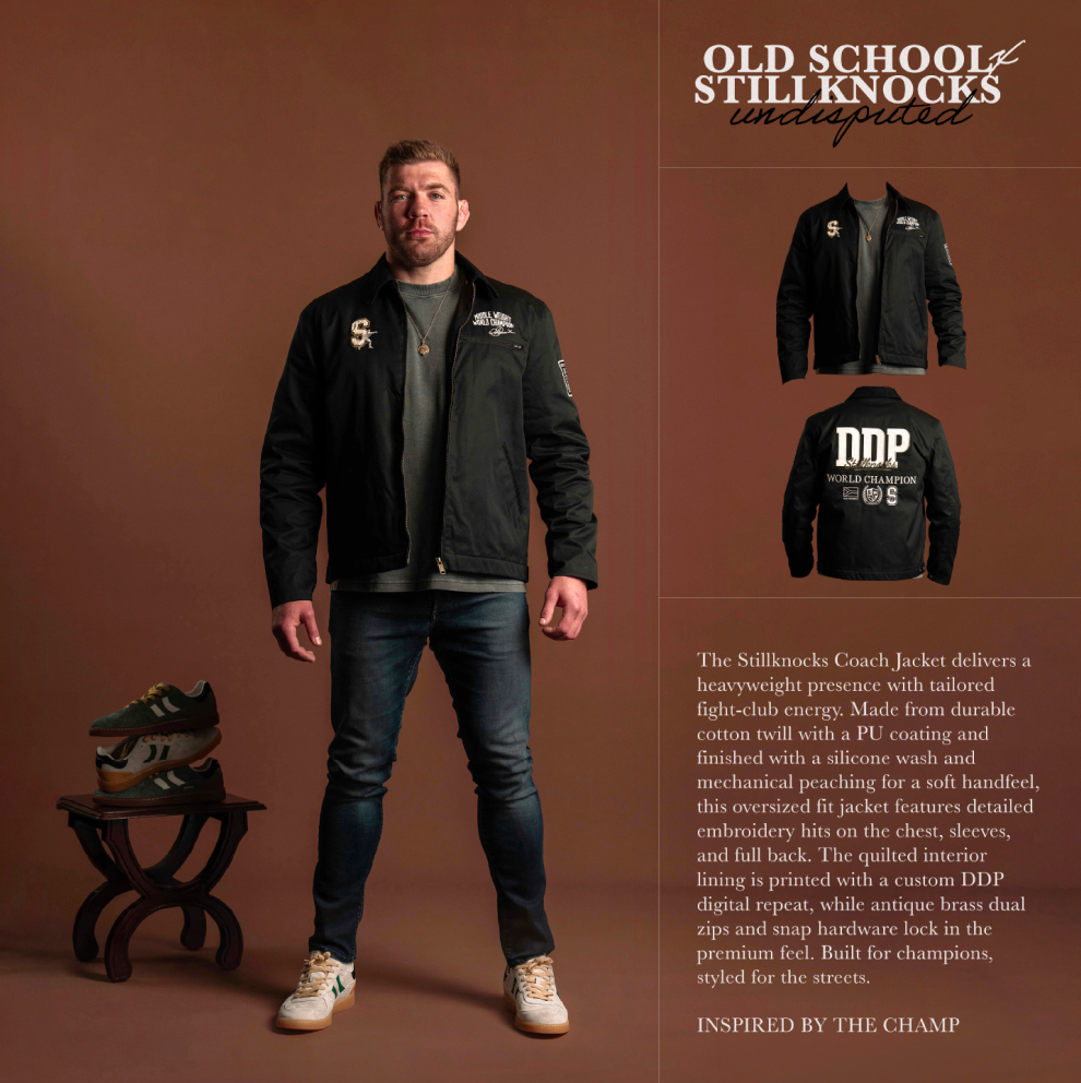 Designed in an oversized cut, it features custom embroidery hits on the chest, sleeve, and a bold full-back graphic. Inside, a quilted lining printed with a bespoke DDP digital repeat adds both comfort and attitude. Antique brass hardware – including dual zips and branded snap buttons – lock in the premium details.